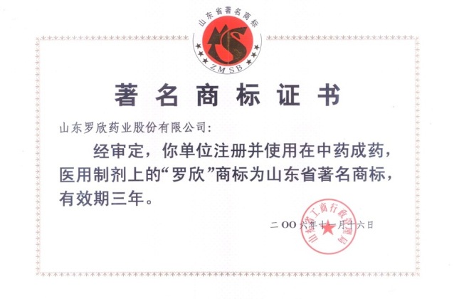 在2006年度的山東省著名商標評選中,山東羅欣的“羅欣”商標被山東省工商局評為“山東省著名商標”,這個殊榮使“羅欣”品牌身價倍增,意味著“羅欣”品牌在今后發展中將更加受到工商部門的悉心保護和消費者的青睞。