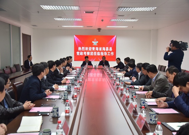 上圖為青海省海晏縣黨政考察團與市區領導座談交流的情景