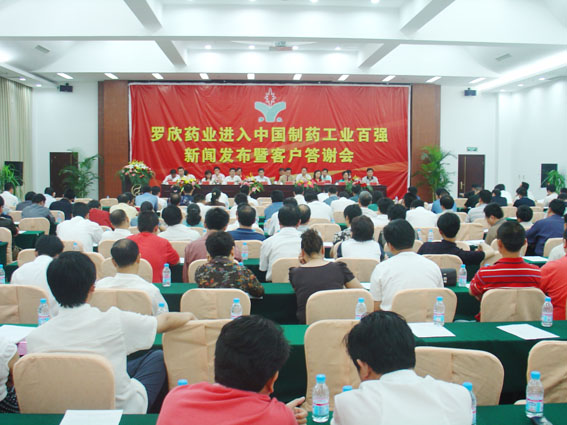 5月26日上午,羅欣藥業(yè)進入中國制藥工業(yè)百強新聞發(fā)布暨客戶答謝會在臨沂市南坊新區(qū)頤正園賓館圓滿召開。 來自全國各地的300多位供銷代表以及臨沂市的各大媒體記者參加了這次會議。會上,股份公司總經(jīng)理李明華女士,就羅欣藥業(yè)2006年度進入“中國制藥工業(yè)百強企業(yè)”、羅欣藥業(yè)被國家食品藥品監(jiān)督管理局南方醫(yī)藥經(jīng)濟研究所評為“2006年度十大最具成長力藥企”、羅欣商標被評為“山東省著名商標”等進行了新聞發(fā)布。集團董事長劉保起先生和臨沂市食品藥品監(jiān)督管理局局長崔增久先生分別在會上作了重要講話。