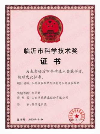 羅欣藥業始終堅持“科技興企”的戰略方針,加大科研投入,不斷推出高科技含量、高質量、高附加值的“三高”產品。2008年9月,公司研發的產品硫酸頭孢匹羅及注射用硫酸頭孢匹羅、頭孢硫瞇及注射用頭孢硫瞇的新技術獲得臨沂市科學技術進步獎二等獎,頭孢孟多酯鈉及注射用頭孢孟多酯鈉、頭孢克肟的新技術獲得臨沂市科學技術進步獎三等獎。