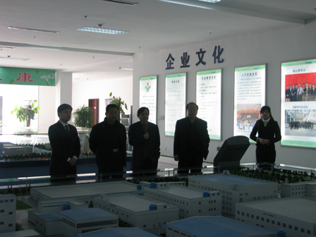 上圖為費縣食品藥品監督管理局局長楊振忠(前排左二)、費縣人民醫院院長時建華(前排右一)參觀公司展廳時的情景
