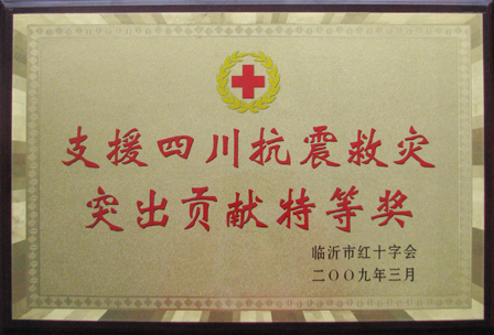 2009年3月,鑒于我公司在支援四川抗震救災(zāi)工作中做出的突出貢獻,臨沂紅十字會授予我公司“支援四川抗震救災(zāi)突出貢獻特等獎”榮譽稱號。