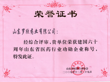 2009年12月,山東羅欣藥業(yè)股份有限公司被山東省醫(yī)藥行業(yè)協(xié)會評為建國六十周年山東省醫(yī)藥行業(yè)“功勛企業(yè)”。