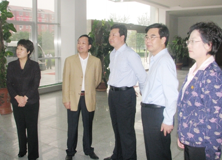 上圖為省委常委、宣傳部長李群(右三)、市委書記、市人大常委會主任連承敏(右二)、 市委常委、宣傳部長丁鳳云(右一)、區委副書記、區長劉淑秀(左一)一行參觀公司展廳時的情景